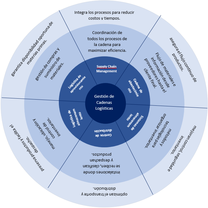 Este gráfico tipo mándala presenta los seis conceptos fundamentales de la gestión de cadenas logísticas: cadena de abastecimiento, Supply Chain Management, logística de aprovisionamiento, logística de almacenamiento, centros de distribución y sistemas de almacenamiento. Cada sección muestra de manera organizada la definición y la importancia de cada concepto, permitiendo visualizar cómo se relacionan entre sí dentro de la estructura logística empresarial.